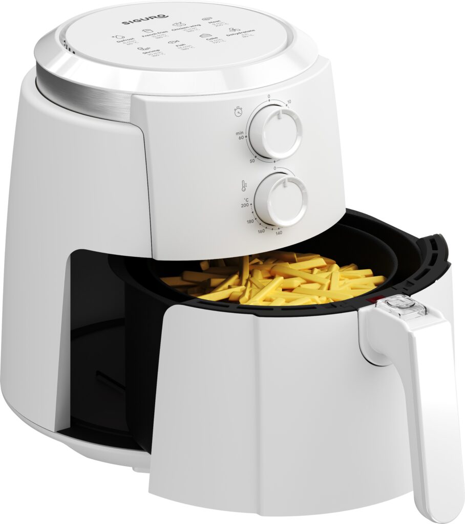 Für die Zubereitung Ihrer Lieblingsgerichte mit der Siguro AF-G351W Easy Fry Plus benötigen Sie nur eine minimale Menge Öl, dennoch werden die Speisen sehr schmackhaft, sehen großartig aus und sind zugleich gesund – ganz ohne unnötige Kalorien und Fett. Die Fritteuse ist die perfekte Ergänzung für jeden Haushalt – sie ersetzt problemlos mehrere Geräte und bereitet knusprige Pommes, Kroketten, amerikanische Kartoffeln, Hähnchen, Steak, Meeresfrüchte oder Fisch, aber auch süße Desserts und vieles mehr zu.