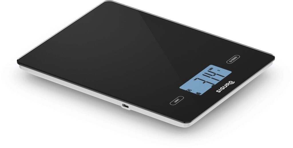 Die Siguro Digitalwaage verfügt über einen integrierten ökologischen Akku, der eine Laufzeit von bis zu 2 Monaten mit einer einzigen Ladung verspricht. Diese Lösung ist nicht nur umweltfreundlich, sondern spart vor allem Kosten und Zeit beim Austausch herkömmlicher Batterien. Der Akku kann über das mitgelieferte USB-C-Kabel aufgeladen werden.