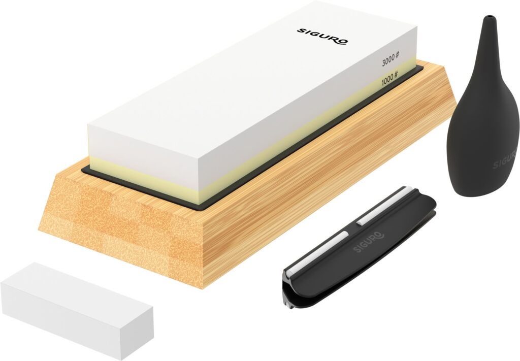 Neben des Siguro Bamboo Base 1000/3000 ist im Paket auch eine rutschfeste Silikonunterlage enthalten, die ein sicheres Arbeiten ermöglicht. Außerdem gibt es einen praktischen Leitfaden, mit dem auch Anfänger mit dem Schärfen von Messern beginnen können. Da dieser Stein für das Schleifen mit Wasser konzipiert ist, befindet sich in der Verpackung auch ein Flüssigkeitsspender. Natürlich gibt es einen Spachtel zum Vergleichen der Oberfläche.
