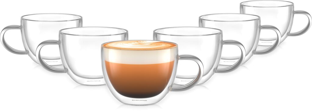 Mit den einzigartigen Thermosgläsern von Siguro können Sie das perfekte Erlebnis eines köstlichen Cappuccinos genießen. Diese 280-ml-Designgläser sind mundgeblasen und bestehen aus hochfestem Borosilikatglas, das sich durch eine Reihe hervorragender Eigenschaften, insbesondere der Wärmeisolierung, auszeichnet. Sie eignen sich sowohl für den Alltag als auch für festliche Anlässe und sind auch eine interessante Geschenkidee. Im Paket sind sechs Siguro-Gläser enthalten - so können Sie auch Ihren Partner, Kollegen oder Besucher mit einem Cappuccino erfreuen.