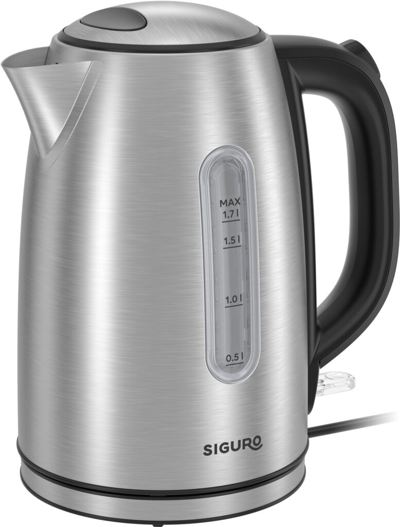 Die optimal geformte Öffnung des Wasserkochers erleichtert das bequeme Einfüllen von Wasser in die Tassen. Wesentliche Ausstattungsmerkmale des Siguro EK-D170SS Metalist Wasserkochers sind ein Deckelverschluss und Sicherheitsmerkmale wie zum Beispiel die automatische Abschaltung, wenn der Kessel während des Kochens entfernt wird, wenn kein Wasser vorhanden ist und wenn der Siedepunkt erreicht ist. Die unter dem Boden verborgene Heizspirale ist gegen Kalkablagerungen geschützt.