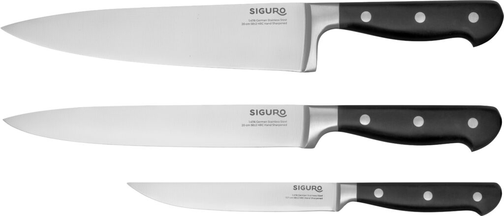 Kochen sollte sicher und komfortabel sein und nicht zuletzt Spaß machen. Deshalb kombinieren die Messer Siguro Hikari leichte Materialien mit ergonomischen ABS-Griffen, die einen bequemen Griff gewährleisten und die Ermüdung beim Arbeiten verringern. Die ausgewogene Konstruktion, die auf den Schutz der Finger ausgerichtet ist, gewährleistet maximale Sicherheit beim Schneiden. Sie werden die Arbeit mit diesen Messern buchstäblich lieben.