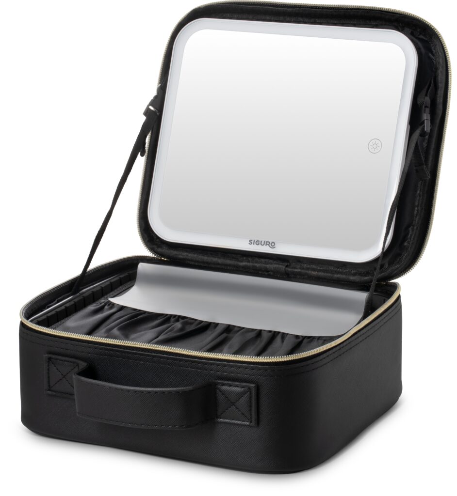 Die Kombination aus Kosmetikkoffer und LED-Spiegel Siguro Pure Beauty Cassie B550B eignet sich sowohl zum einfachen Transport und zur Organisation von Kosmetikprodukten und -werkzeugen als auch als praktische Hilfe für perfektes Make-up, Augenbrauenstyling oder Hautpflege – nicht nur auf Reisen. Der Koffer verfügt über Fächer, und der Spiegel mit einstellbarer LED-Beleuchtung ist herausnehmbar und separat nutzbar. Der integrierte Akku sorgt dafür, dass Sie sich überall schminken können, ohne eine Steckdose suchen zu müssen. Außerdem werden Sie das geringe Gewicht und den Tragegriff für einfaches Mitnehmen schätzen –und das elegante Design macht ihn zu einem stilvollen Accessoire für jede Frau.