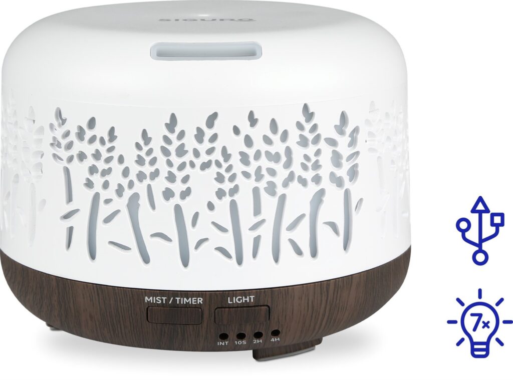 Der Aroma-Diffuser beduftet und befeuchtet die Luft in Ihrem Zuhause oder Büro in wenigen Minuten. Er gibt Wirkstoffe in Form feiner Dämpfe an die Luft ab, deren Einatmen positive Auswirkungen auf den Körper hat. Die Wassermenge (300 ml) reicht für bis zu 30 Stunden Dauerbetrieb. Der Siguro AD-E211DW Marsh Fritillary hat eine praktische Hintergrundbeleuchtung, die in 7 verschiedenen Farben eingestellt werden kann (weiß, rot, gelb, grün, azurblau, blau, lila), schaffen Sie einfach die ideale Atmosphäre für Entspannung und Erholung. Natürlich gibt es eine automatische Abschaltfunktion für den Fall, dass der Tank kein Wasser mehr enthält.