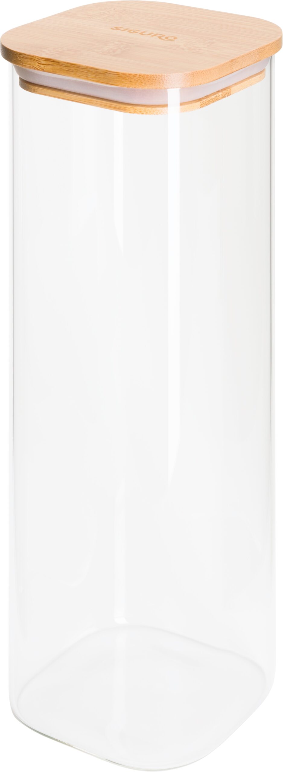 Mit dem kompletten Sortiment der Siguro Bamboo Dosen wird Ihr Badezimmer wieder aufgeräumt sein. In diesen Behältern lassen sich verschiedene Artikel aufbewahren - von Kosmetika, Waschmitteln und Haarschmuck bis hin zu Waschpulver oder Badesalz. Das Siguro Bamboo Glas mit einem Fassungsvermögen von 2.400 ml besteht aus langlebigem Borosilikatglas und wird durch einen natürlichen Bambusdeckel mit Silikondichtung ergänzt. Die gelagerten Gegenstände werden so perfekt vor Schmutz geschützt. Ein weiterer Vorteil ist, dass Sie auch die unansehnliche Originalverpackung loswerden können - mit Siguro Bamboo haben Sie ein schönes und perfekt organisiertes Badezimmer.