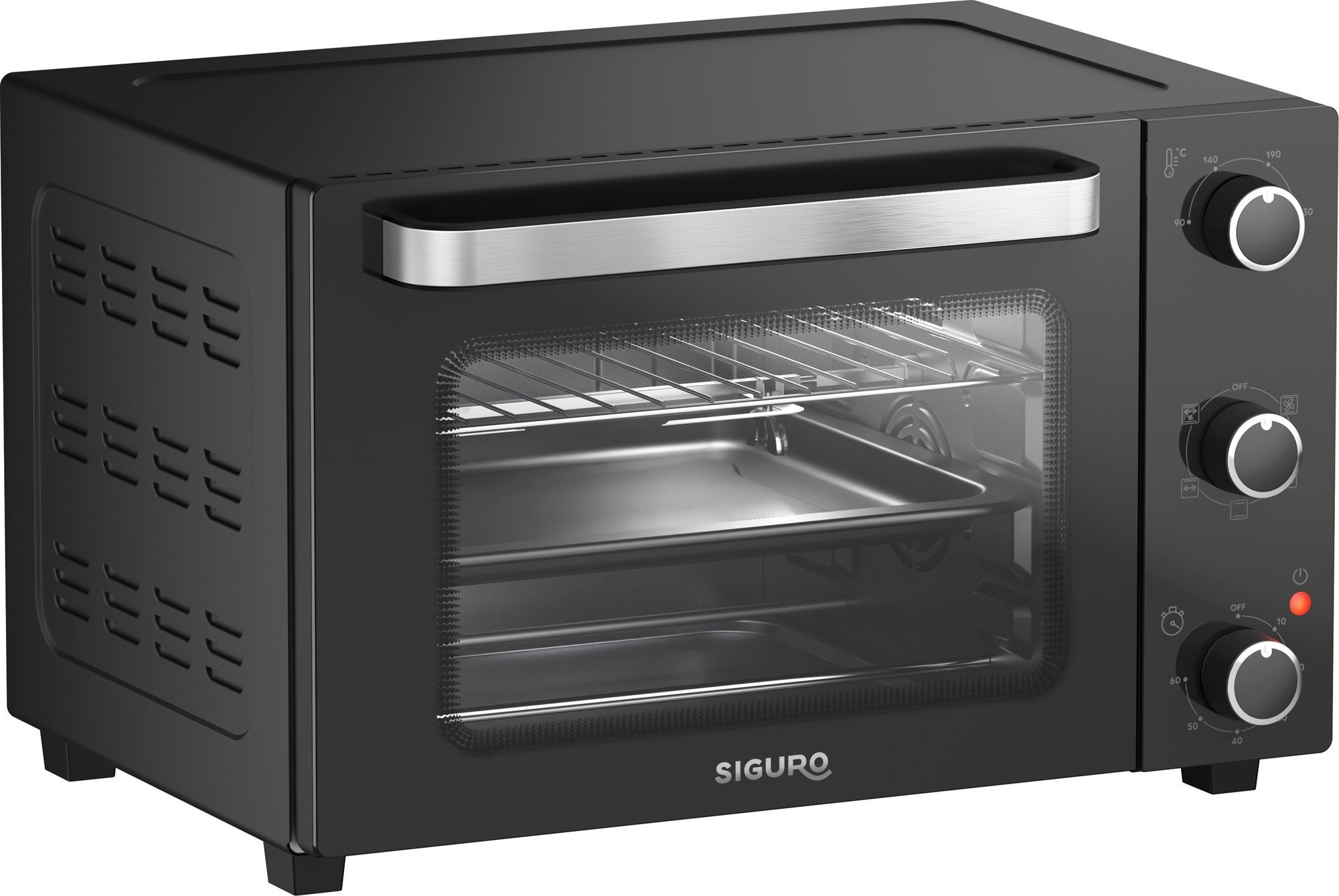 Siguro-Geräte zeichnen sich durch ihre einfache Bedienung aus. Das ist beim Mini-Backofen Siguro CO-E280B Perfect Roast & Grill nicht anders, der über drei Drehknöpfe verfügt. Der obere Drehknopf dient zur Einstellung der Backtemperatur von 90 bis 230 °C. Mit dem unteren Drehknopf stellen Sie die gewünschte Backzeit ein - bis zu 60 Minuten. Außerdem gibt es eine Kontrollleuchte, die den Betrieb des Minibackofens anzeigt.