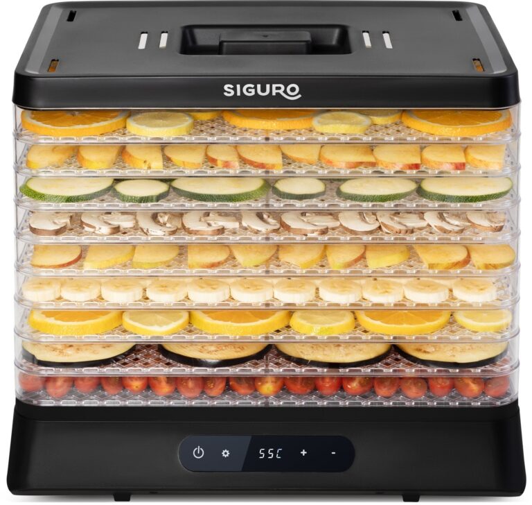 Der Siguro FD-G500B Super Dry bietet insgesamt 9 geräumige Kunststoffplatten mit speziell geformten Belüftungsöffnungen für eine gleichmäßige Trocknung über die gesamte Schale. Der leistungsstarke Motor befindet sich an der Unterseite und ermöglicht einen optimalen Luftstrom von unten nach oben. Dadurch wird sichergestellt, dass jedes Stück perfekt getrocknet wird, egal ob es unten, in der Mitte oder oben liegt.