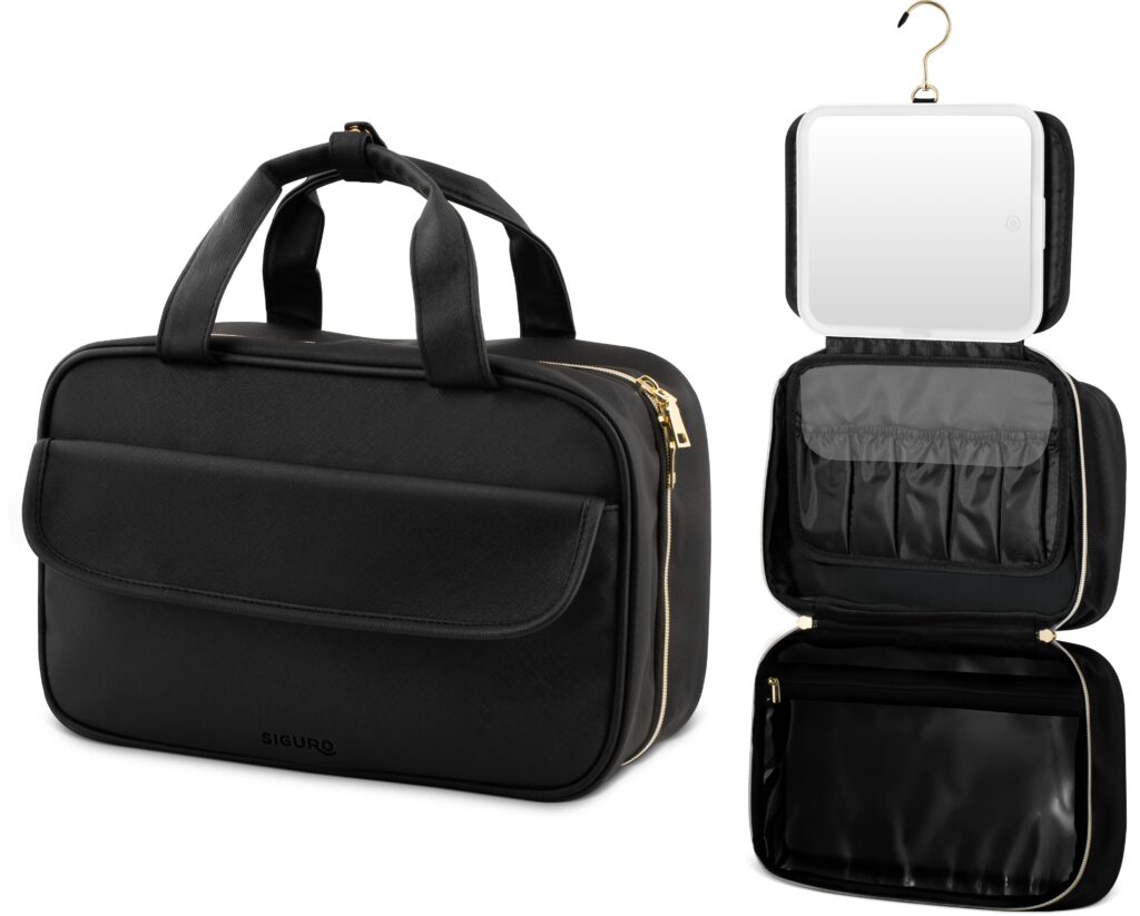 Die Reise-Toilettentasche mit elegant integriertem Kosmetikspiegel Siguro Pure Beauty Isla B730B ist der ideale Begleiter für alle, die ihre Kosmetik perfekt organisiert haben möchten und zugleich stets gepflegt aussehen wollen. Das kompakte, leichte Set vereint alles, was Sie brauchen – praktische Innenfächer und Außentaschen für Kosmetik, einen großen, abnehmbaren Spiegel mit LED-Beleuchtung und drei Lichtmodi (kalt, warm und natürliches Tageslicht) sowie stufenloser Helligkeitsregelung. Die Stromversorgung übernimmt ein integrierter Akku, und der drehbare Aufhängehakenermöglicht das bequeme Aufhängen der Tasche, z. B. an Badezimmertüren oder Garderoben. Das alles in einem eleganten Design, das als stilvolles Accessoire zu Ihrem Gepäck passt.