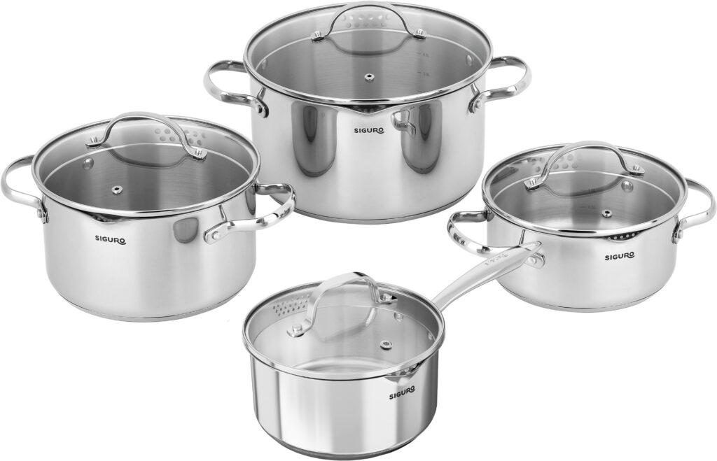 Das praktische Topfset Siguro Pure Delight bietet die perfekte Lösung für das tägliche Kochen – hochwertiger Edelstahl, durchdachte Deckel und integrierte Ausgießnasen für einfaches Abgießen. Dieses 8-teilige Set enthält zwei Kasserollen, einen Kochtopf und einen Stieltopf – jeweils mit Deckel – und ermöglicht eine vielseitige Nutzung bei der Zubereitung verschiedenster Gerichte. Dank robuster Materialien, funktionalem Design und eleganter Optik werden die Töpfe zu einem zuverlässigen Helfer im Alltag und zugleich zu einem stilvollen Bestandteil Ihrer Küche.