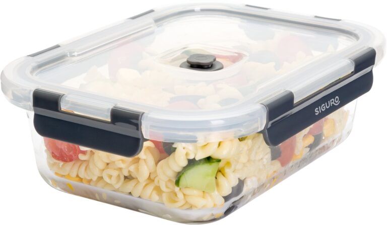 Der 1.050 ml fassende Siguro-Vakuum-Nahrungsmittelbehälter ist aus hochwertigem Borosilikatglas gefertigt, das weder Gerüche noch Verfärbungen annimmt. Er zeichnet sich außerdem durch seine außergewöhnliche Temperatur- und Chemikalienbeständigkeit aus - die Glasschale kann problemlos in der Spülmaschine gereinigt werden. Dank des transparenten Designs finden Sie immer sofort, was Sie brauchen, egal, wo die Dose steht.