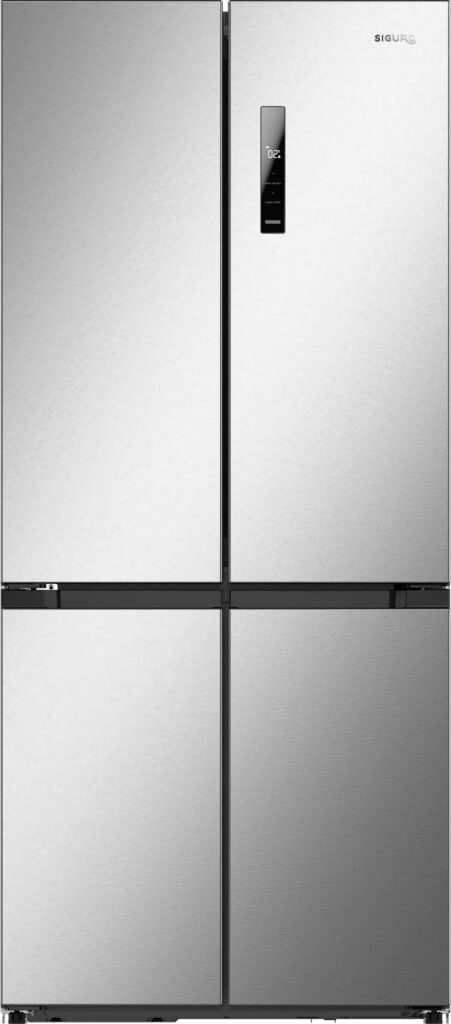 The SIGURO MD-C232S Premium falls into energy class C and consumes just 196 kWh per year, making it one of the most energy-efficient appliances in the American refrigerator category. Temperature control in this case is handled by a clear touch control panel on the door, which allows independent temperature adjustment in the cooling (2 to 8 °C) and freezing (-24 to -16 °C) sections. The control panel locks automatically after 30 seconds of inactivity and when all doors are closed. To unlock, hold the lock icon for 3 seconds.