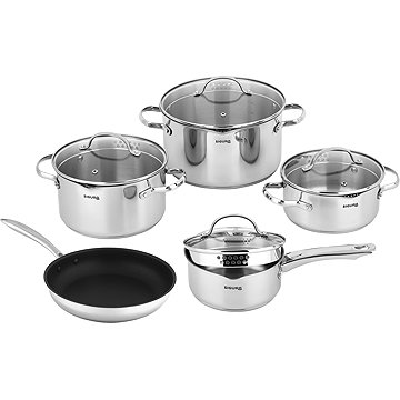 Cookware Set - compatible with gas, electric, induction, glass-ceramic and halogen cooktop type, 4 pots and 1 pan in the set, safe for use with non-sharp metal utensils, pouring edge, oven safe and dishwasher safe, oven-safe up to 250 °C, body material stainless steel, stainless steel pot exterior surface, stainless steel pot interior surface, stainless steel pot handle finish, lid included, black and stainless steel colour