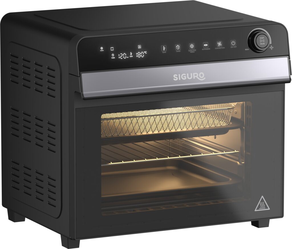 A Siguro CO-L280B Air Fry Roast Premium összesen 6 fűtőelemmel van felszerelve – 4 felül és 2 alul –, valamint egy nagy teljesítményű turbóventilátorral, amely ropogós textúrát és szép színt ad az ételeknek. A mini sütő elegáns fekete dizájnjával hívja fel magára a figyelmet – tökéletesen illik bármilyen konyhapultra. Az alkalmazott anyagok könnyen tisztíthatók, így a sütő karbantartása nem vesz igénybe sok időt. A masszív fogantyú megkönnyíti a dupla biztonsági üveggel ellátott ajtó kinyitását.