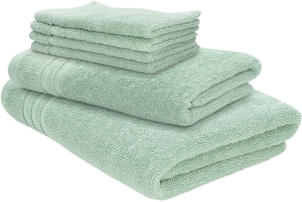 Törölköző szett - 1× fürdőlepedő (70 × 140 cm), 1× törölköző (50 × 100 cm) és 4× kis törölköző (30 × 50 cm), török pamutból készült, 100%-ban természetes anyag, nagy nedvszívó képesség, OEKO-TEX® Standard 100 tanúsítás, 60°C-on mosd (öblítő nélkül), alkalmas szárítóba, gramázs 500 g/m², hurok a felakasztáshoz, zöld szín