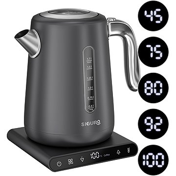 A Siguro Darwin D770Y vízforralónál öt előre beállított hőmérséklet közül választhatsz – 45, 75, 80, 92 és 100 °C. Ha más értékre van szükséged, csak használd az érintésvezérlést, és állítsd be a hőmérsékletet 45 és 100 °C között 1 °C-os lépésekben. A vízforraló így lehetővé teszi olyan italok precíz elkészítését, amelyekhez nem kell forrásban lévő víz – például különféle teák, kávé vagy bébiételek. Ha a bekapcsoló gombot hőmérséklet-választás nélkül nyomod meg, a forralás automatikusan 100 °C-ra indul. Az áttekinthető LED-kijelzőn mindig látható a víz aktuális hőmérséklete, így tökéletesen végigkövetheted a forralási folyamatot.