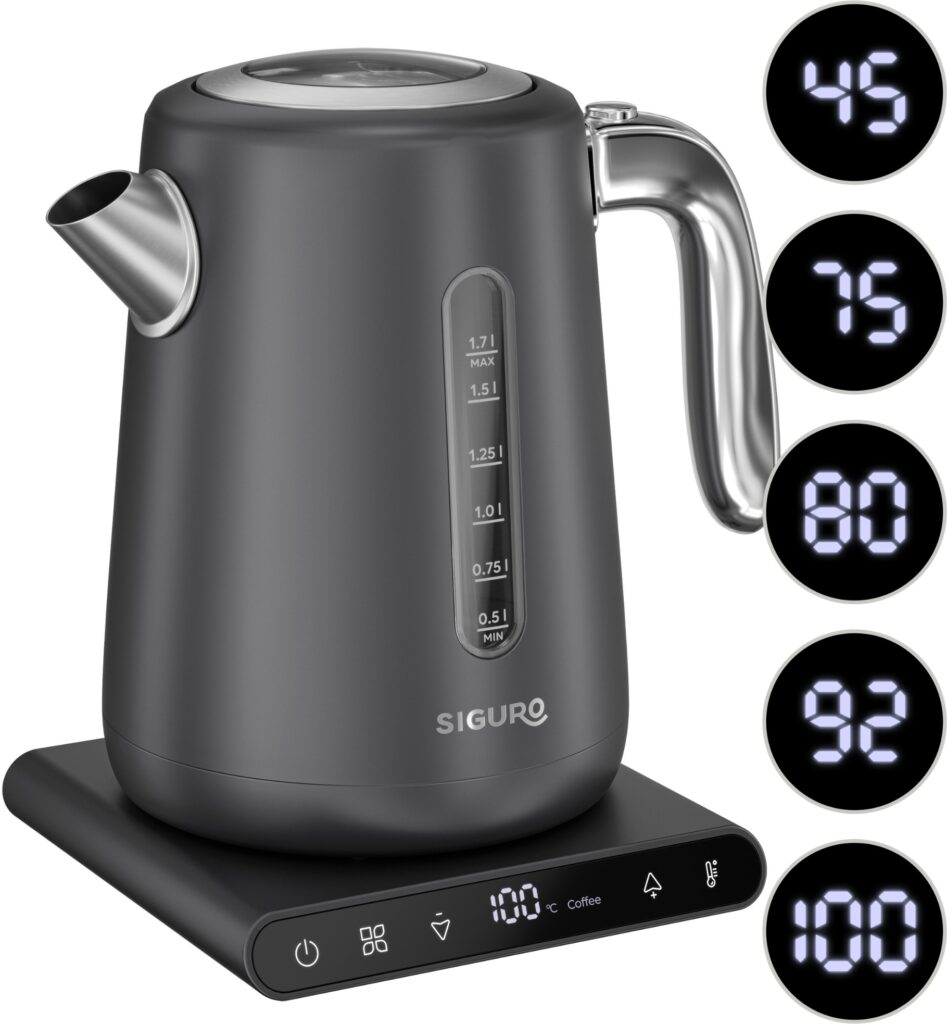 A Siguro Darwin D770Y vízforralónál öt előre beállított hőmérséklet közül választhatsz – 45, 75, 80, 92 és 100 °C. Ha más értékre van szükséged, csak használd az érintésvezérlést, és állítsd be a hőmérsékletet 45 és 100 °C között 1 °C-os lépésekben. A vízforraló így lehetővé teszi olyan italok precíz elkészítését, amelyekhez nem kell forrásban lévő víz – például különféle teák, kávé vagy bébiételek. Ha a bekapcsoló gombot hőmérséklet-választás nélkül nyomod meg, a forralás automatikusan 100 °C-ra indul. Az áttekinthető LED-kijelzőn mindig látható a víz aktuális hőmérséklete, így tökéletesen végigkövetheted a forralási folyamatot.