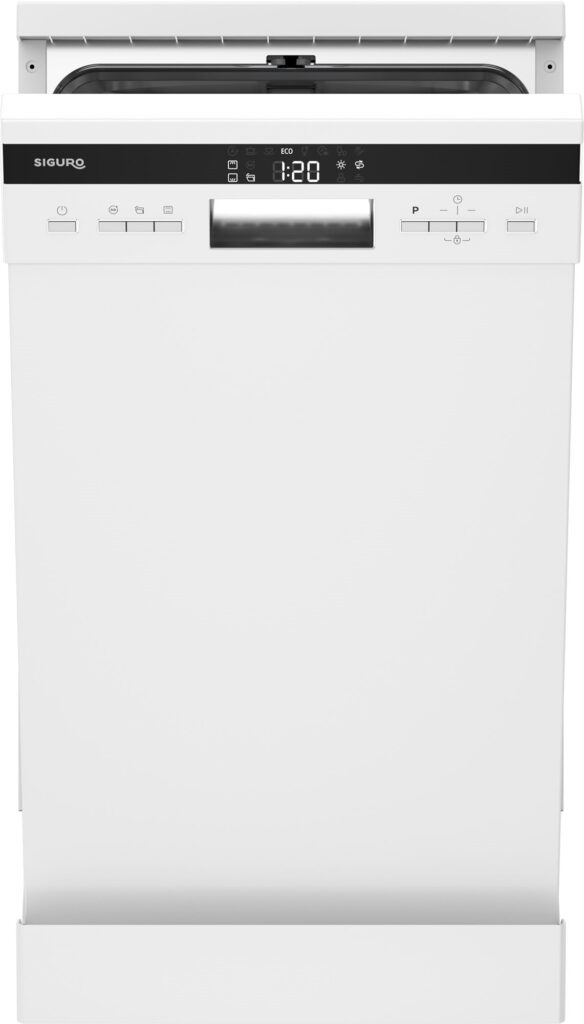 A zónamosás (fél töltet) csak az alsó vagy csak a felső kosárban segít további víz- és áramköltségeket megtakarítani. A Siguro DW-F453W Efficlean mosogatógépfelhasználóbarát, minden funkció és program kényelmesen beállítható a nagyméretű mechanikus gombokkal ellátott kezelőpanelen. Tartalmaz egy fehér háttérvilágítású információs LED kijelzőt is. A mosogatógép jelzőfényekkel figyelmeztet, ha só- vagy öblítőszerhiányt érzékel.