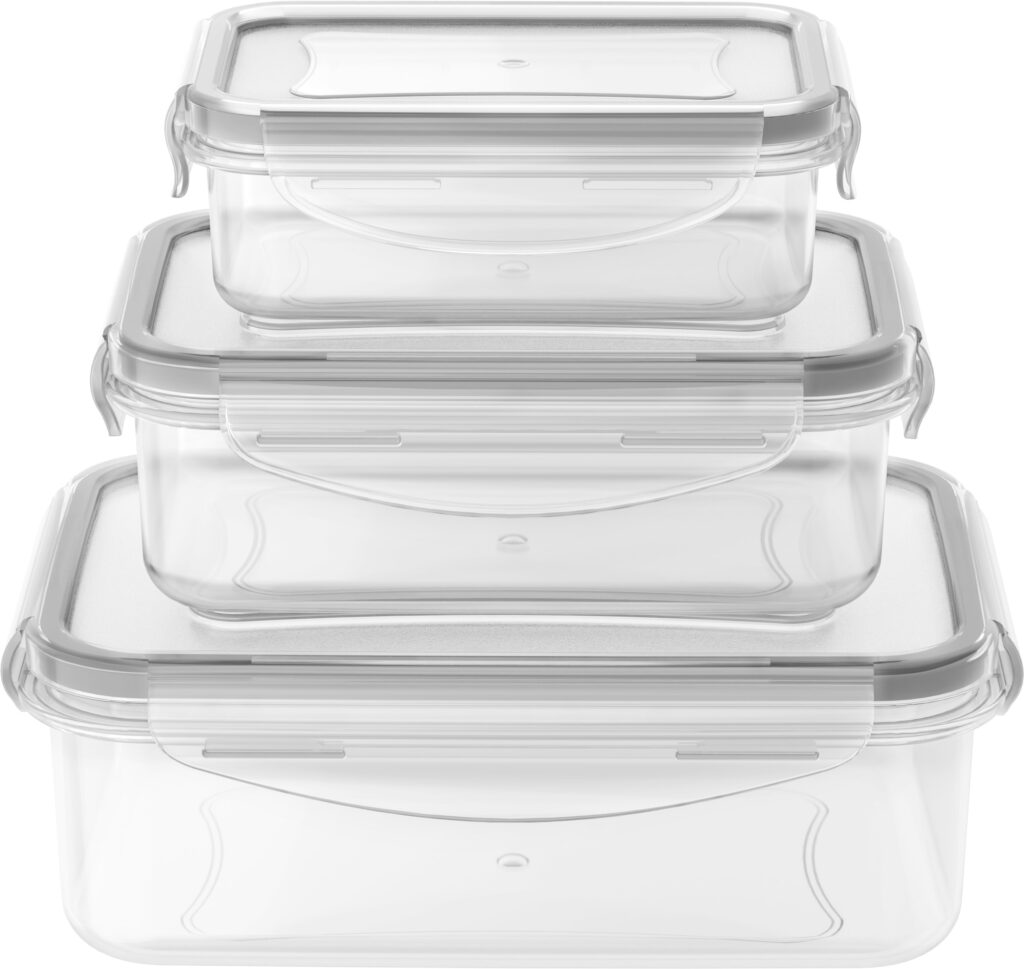 Ételtároló doboz szett - téglalap alakú, műanyagból (PP) készült, szilikontömítéssel ellátott fedelek, az élelmiszerek megőrzésére és eltarthatósági idejének meghosszabbítására tervezték, nem szívja magába a szagokat vagy illatokat, alkalmas hűtőszekrénybe és fagyasztóba (-25 °C-ig), mikrohullámú sütőbe (fedél nélkül, 2 perc ≤ 700 W teljesítményen), mosogatógépben mosható (65 °C-ig)