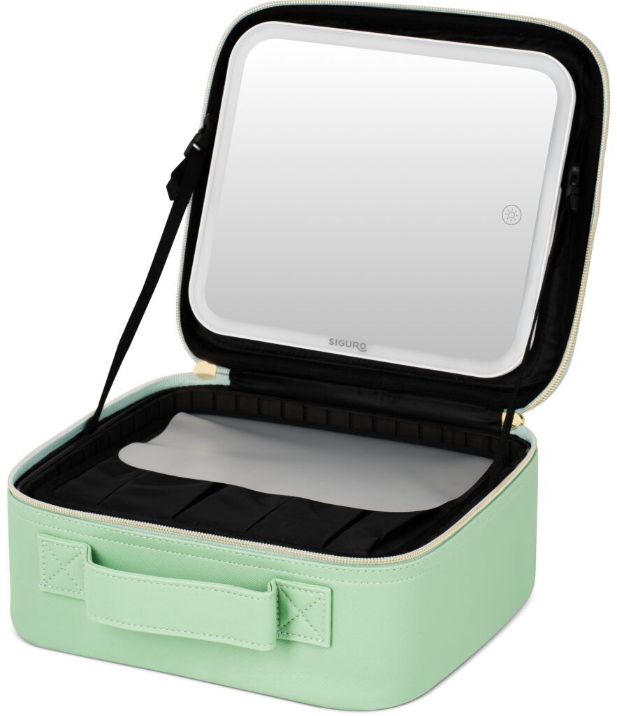 A Siguro Pure Beauty Cassie B550E kozmetikai táska és LED-tükör kombinációja a kozmetikai termékek és eszközök egyszerű szállítására és rendszerezésére használható, valamint praktikus eszköz a tökéletes sminkeléshez, szemöldök- vagy bőrápoláshoz útközben. Rekeszekkel van ellátva, és az állítható LED-világítású tükör kivehető, és külön is használható. A beépített akkumulátor biztosítja, hogy bárhol sminkelhetsz, ahol csak szükséged van rá, anélkül, hogy konnektort kellene keresgélned. Értékelni fogod at alacsony súlyt és a könnyű hordozást biztosító fogantyút, vagy az elegáns kialakítást, amely minden nő stílusos kiegészítőjévé teszi.