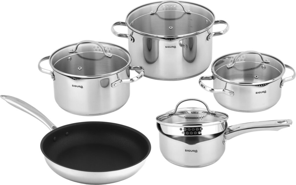 A Siguro Pure Delight edények és serpenyők prémium minőségű, nem mérgező 304 rozsdamentes acélból készülnek a maximális tartósság és hosszú élettartam érdekében. Az ILAG® Professional S serpenyő tapadásmentes felülete sem tartalmaz vagy bocsát ki mérgező anyagokat. Az egész készlet minden típusú főzőlapon használható, beleértve az indukciósat is. A fedővel ellátott edények és a serpenyő sütőálló - akár 250 °C-os hőmérsékletet is gond nélkül kibírnak, és az egész készlet mosogatógépben mosható.