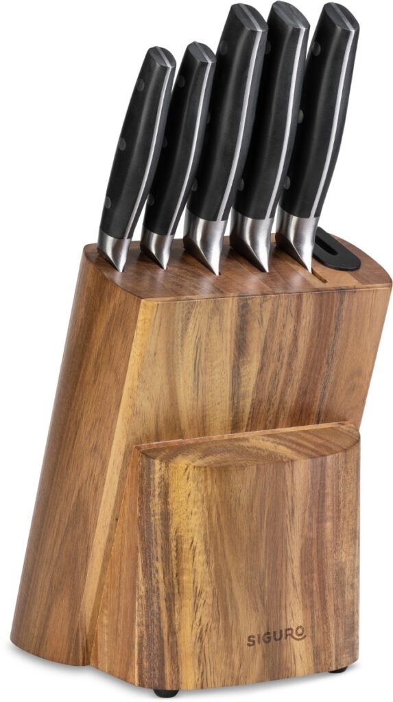 A készlethez tartozik egy elegáns, csúszásmentes lábakkal ellátott blokk is, amely biztosítja a Siguro Sugoi kések biztonságos tárolását, miközben védi a pengéket. Praktikus bónusz a beépített élező, amely lehetővé teszi, hogy a pengék élességét másodpercek alatt könnyen visszaállítsd. A blokk ökológiai, társadalmi és gazdasági normák szerint kezelt erdőkből származó, tanúsított akácfából készül.