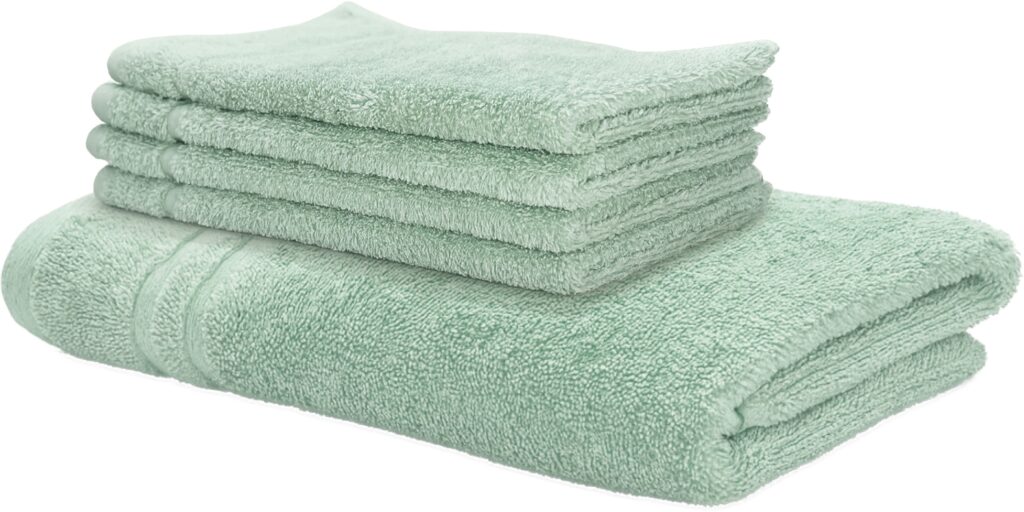 Törölköző szett - 1× törölköző (50 × 100 cm) és 4× kis törölköző (30 × 50 cm), török pamutból készült, 100%-ban természetes anyag, nagy nedvszívó képesség, OEKO-TEX® Standard 100 tanúsítvány, 60°C-on mosd (öblítő nélkül), alkalmas szárítóba, gramázs 500 g/m², hurok a felakasztáshoz, zöld szín