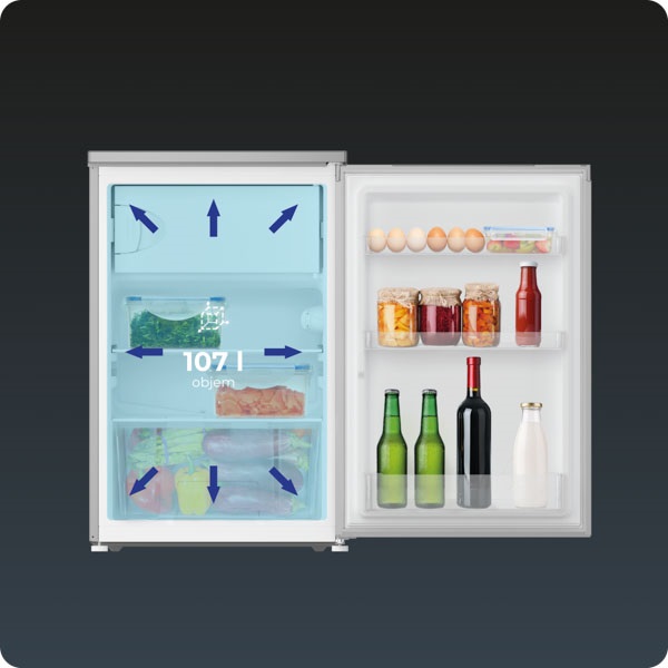 Az energiatakarékos Siguro TT-E250S Chill & Freeze hűtőszekrény 107 literes hasznos térfogattal rendelkezik, amelyből 94 liter a hűtőtérben található. A teret két állítható edzett üvegpolc osztja meg – szükség esetén könnyedén megváltoztathatod a tárolás elrendezését. Az ajtóban rekeszek találhatók üvegek, befőttesüvegek vagy kisebb élelmiszerek tárolására, valamint egy kihúzható Fresh doboz a gyümölcsök és zöldségek tárolására.