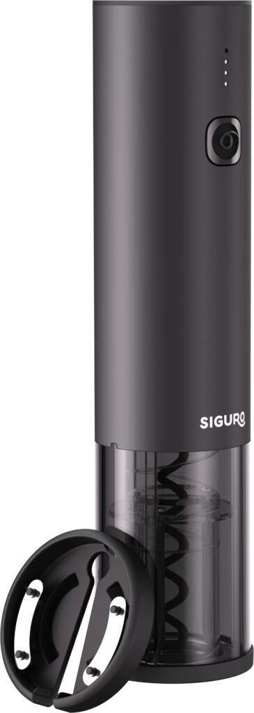 S elektrickým otvírákem Siguro WineMaster otevřete snadno, rychle a zcela bez námahy všechny běžné typy láhví s vínem, které mají "rovný" korkový uzávěr. Otvírák je vybavený integrovaným Li-Ion akumulátorem, LED podsvícením a součástí je i řezačka pro bezproblémové odstranění fólie, která je elegantně připnutá na těle otvíráku, tudíž je vždy po ruce.