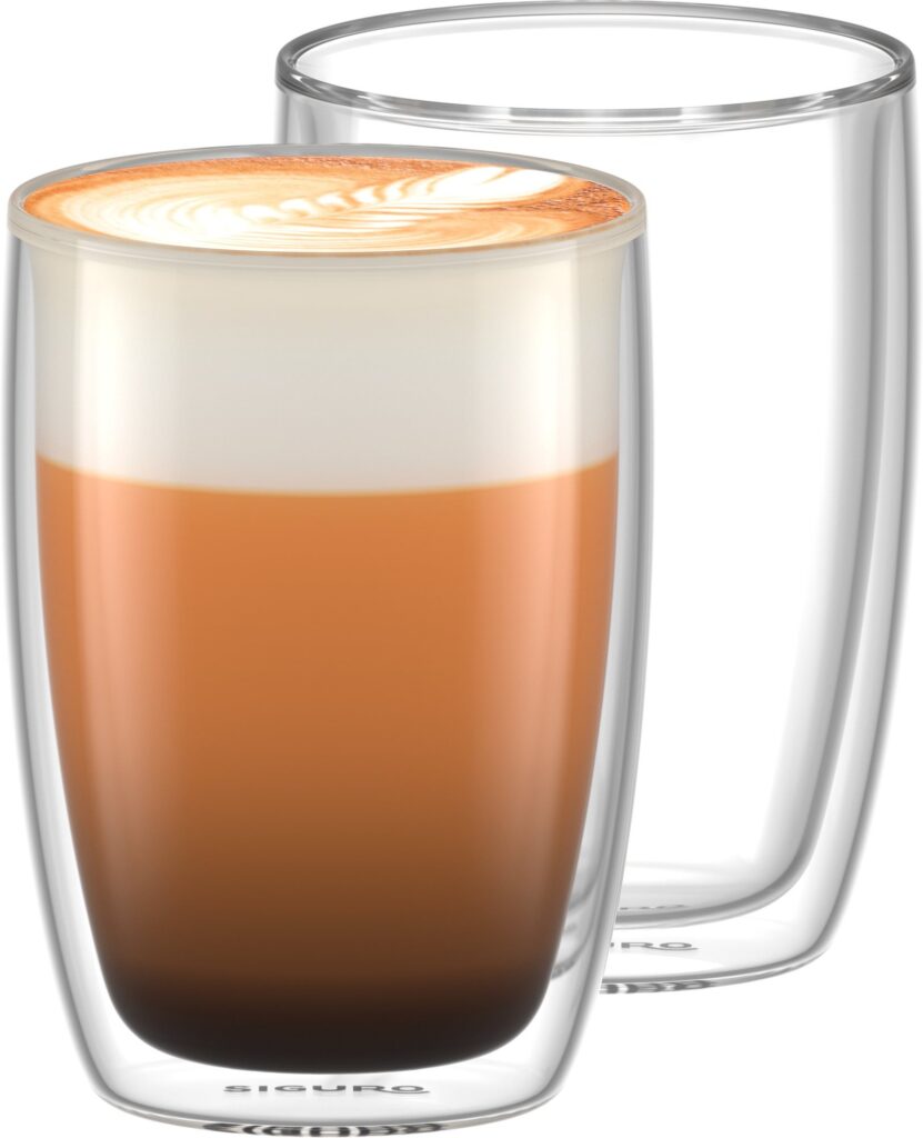 S jedinečnými termosklenicemi Siguro si budete moci dopřát dokonalý prožitek z lahodného cappuccina. Tyto designové sklenice o objemu 170 ml jsou ručně foukané a vyrobené z vysoce odolného borosilikátového skla, které se vyznačuje celou řadou skvělých vlastností, zejména termoizolací. Perfektně se hodí nejen pro každodenní i slavnostní stolování, ale jsou také zajímavým nápadem na dárek. Součástí balení jsou hned dvě sklenice Siguro – cappuccino tak můžete připravit i pro partnera, kolegu či návštěvu.
