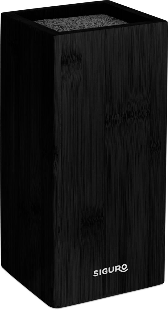 Hľadáte blok na nože, ktorý nielen poskytne ochranu na ostrie nožov, ale aj zaujme svojim vzhľadom? Predstavujeme vám blok na nože Siguro Bamboo Line v čiernom vyhotovení, ktorý je namiesto klasických drážok na nože celý vyplnený plastovými vláknami – nože tak môžete zasunúť, kamkoľvek chcete, navyše toto riešenie chráni ostrie.