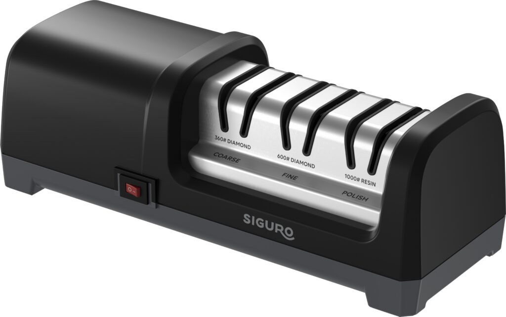Elektrická brúska na nože Siguro Takefu obnoví ostrie vašich nožov v troch krokoch. Disponuje hneď tromi komorami s diamantovými brúsnymi kameňmi na hrubé a jemné brúsenie a leštenie pre precízne výsledky. Okrem toho vás osloví svojim kvalitným a ergonomickým vyhotovením, veľmi jednoduchou obsluhou, ktorú zvládne úplne každý. Okrem toho táto trojkomorová brúska ponúkne elegantný dizajn v kombinácii čiernej farby a nehrdzavejúcej ocele, vďaka čomu sa bude skvele hodiť do každej modernej kuchyne. Pokiaľ si potrpíte v kuchyni na perfektne ostré nože, nemala by vo vašej výbave chýbať táto elektrická brúska na nože.