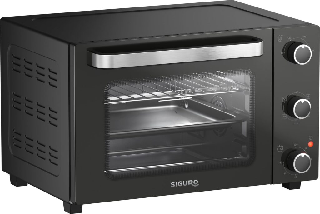 Spotrebiče Siguro sa vyznačujú svojim jednoduchým ovládaním. Nie inak je to pri mini rúre na pečenie Siguro CO-E280B Perfect Roast & Grill, ktorá disponuje troma otočnými gombíkmi. Horný gombík slúži na nastavenie teploty pečenia od 90 do 230 °C. Pomocou spodného gombíka potom nastavíte požadovaný čas pečenia – až 60 minút. Nechýba ani svetelná kontrolka signalizujúca prevádzku mini rúry.