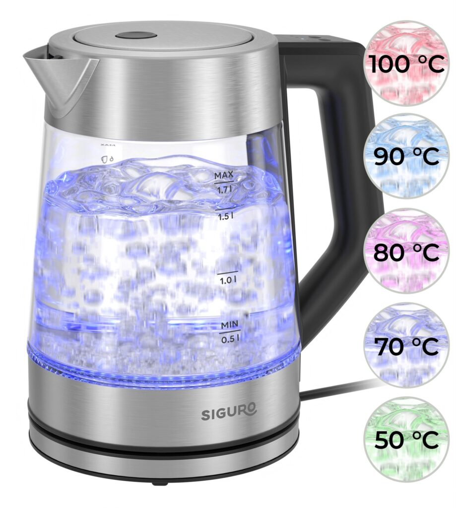 Sklenená rýchlovarná kanvica s podsvietením ponúkne nielen elegantný vzhľad pri varení vody, ale aj možnosť nastavenia cieľovej teploty vody od 50 do 100 °C na prípravu rôznych nápojov či Strix konektor s dlhou životnosťou a v neposlednom rade kvalitné materiály, ktoré sú zdravotne neškodné. Kanvica Siguro EK-S390GL Adelaide je ďalej vybavená dobre viditeľným obojstranným ukazovateľom vodnej hladiny. Vďaka objemu 1,7 litra a príkonu 2 200 W bez problémov pripravíte rýchlo a úsporne horúcu vodu aj pre početnú rodinu. Samozrejmosťou je celý rad bezpečnostných prvkov. Kanvica je navyše počas varenia podsvietená rôznymi farbami, čím sa stane zaujímavým dizajnovým doplnkom každej modernej kuchyne.