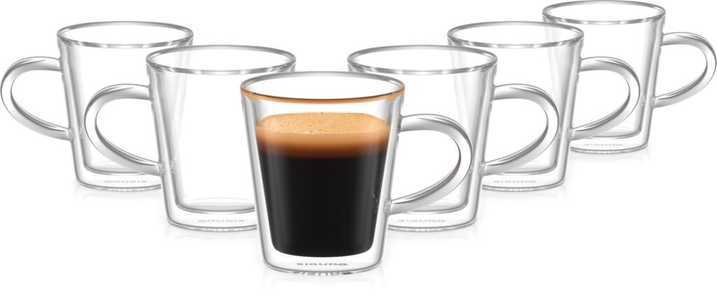 S jedinečnými termopohármi Siguro si budete môcť dopriať dokonalý zážitok z lahodného espressa. Tieto dizajnové poháre s objemom 90 ml sú ručne fúkané a vyrobené z vysokoodolného borosilikátového skla, ktoré sa vyznačuje celým radom skvelých vlastností, najmä termoizoláciou. Perfektne sa hodia nielen na každodenné, ale aj slávnostné stolovanie a tiež sú zaujímavým nápadom na darček. Súčasťou balenia je rovno šesť pohárov Siguro – espressom tak môžete potešiť aj partnera, kolegu či návštevu.