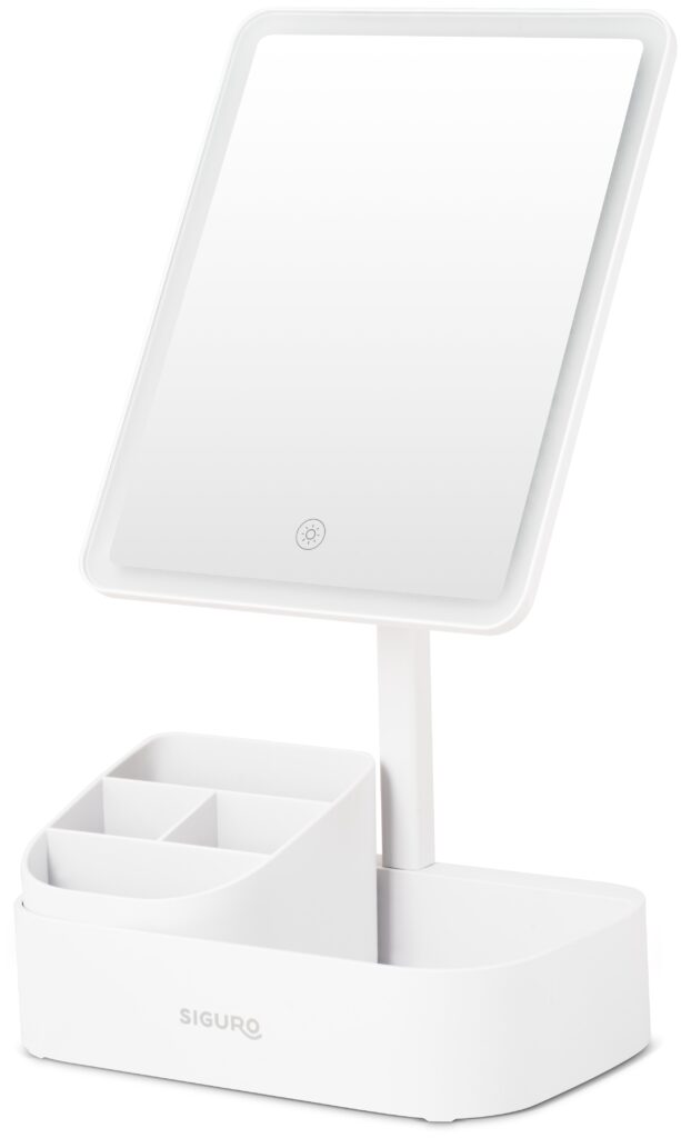 Každodenné líčenie či starostlivosť o pleť budú oveľa pohodlnejšie so stolným kozmetickým zrkadlom Siguro Pure Beauty Celeste L460W, ktoré v sebe spája veľkú zrkadlovú plochu bez zväčšenia, kvalitné LED osvetlenie s tromi režimami a nastaviteľnou intenzitou či praktický úložný priestor v podstavci s vyberateľným organizérom. Do priehradok ľahko uložíte svoje obľúbené štetce, rúže či doplnky, takže budete mať všetko prehľadne poruke a váš kozmetický kútik získa elegantný poriadok. O napájanie sa stará integrovaná batéria.