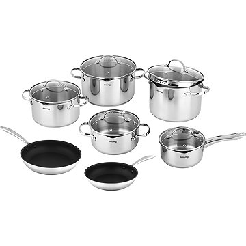 Ak hľadáte nový riad do kuchyne, určite by ste nemali prehliadnuť 12-dielnu sadu Siguro Pure Delight. Táto sada obsahuje štyri hrnce a jednu rajnicu vrátane pokrievok, ako aj dve panvice s odolným nepriľnavým trojvrstvovým povrchom ILAG® Professional S, ktorý zabezpečuje jednoduché varenie a zdravé prípravy jedál s minimálnym množstvom tuku alebo úplne bez neho. Súprava zaujme nielen moderným dizajnom, ale aj veľmi kvalitným vyhotovením z nehrdzavejúcej ocele. Hrnce sú vybavené dômyselnými pokrievkami s praktickými nálevkami na jednoduché zlievanie.