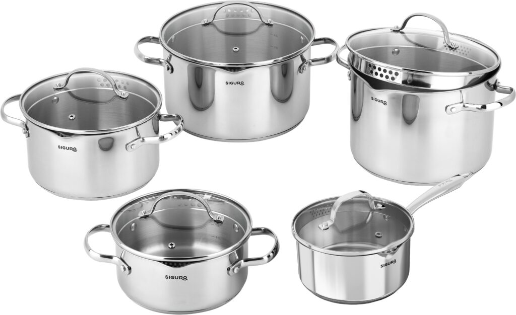 Praktická súprava hrncov Siguro Pure Delight ponúka perfektné riešenie na každodenné varenie – kvalitnú nehrdzavejúcu oceľ, inteligentné pokrievky a integrované vylievacie okraje na ľahkú manipuláciu pri cedení. Táto desaťdielna súprava obsahuje dva hrnce, dva kastróly a jednu rajnicu, všetko vrátane pokrievok, takže pokryje väčšinu bežných kuchárskych potrieb. Vďaka premyslenému vyhotoveniu, odolným materiálom a elegantnému dizajnu sa hrnce stanú spoľahlivým pomocníkom pri každodennom varení a zároveň štýlovým doplnkom vašej kuchyne.