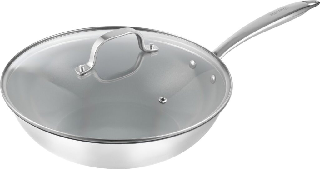 Priemer 28 cm, odolný dvojvrstvový keramický povrch ILAG® XERADUR 5, prvotriedna nehrdzavejúca oceľ 304, možnosť použitia na akomkoľvek type varnej dosky vrátane indukčnej a aj v rúre na pečenie do teploty až 250 °C – to všetko ponúka panvica wok Siguro Pure Delight. Vďaka keramickému povrchu sa vám už nič nepripáli, pri varení vystačíte s minimom tuku a po použití ju môžete bez obáv umývať v umývačke. V neposlednom rade oceníte zdravotne neškodné materiály, bezpečnú nitovanú rukoväť a nárazuvzdornú pokrievku z tvrdeného skla.